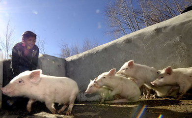 资料图片:西藏山南地区乃东县克松村的村民卓嘎在喂猪(2008年12月15日摄)。新华社记者 普布扎西摄