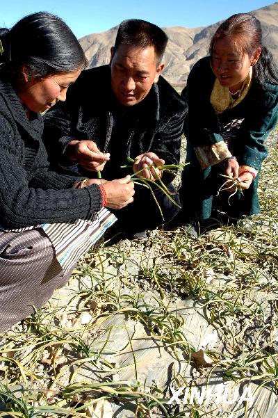 资料图片:2006年12月5日,西藏乃东县的两位农民在种藏蒜能手嘎多次仁(中)的指导下学习大蒜种植经验。新华社记者 索朗罗布 摄