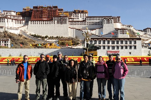 资料图片:4月5日,德国旅行团一行在拉萨布达拉宫前合影。新华社记者 觉果 摄