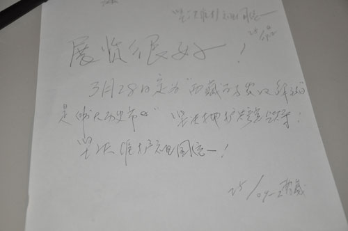 记者在展厅入口看到,两本二百多页的留言簿上,写满了来自全国各地的观众的留言。安徽省一位援藏干部说,展览真实地反映了西藏的面貌,汉族和藏族都是伟大的民族,都是祖国五十六个民族中的优秀成员,团结进步是我们共同的责任和义务。