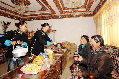 资料图片:西藏堆龙德庆县羊达乡羊达村妇女白珍(右二)和母亲、两个女儿一起在新居欢度藏历新年(2月26日摄)。新华社记者 索朗罗布摄