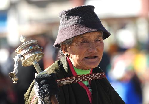 59岁的藏族老阿妈琼吉每天都在自家的客厅里,一边转着转经筒念诵经文,一边看着年小的孙女嬉戏、成长。而当孙女哭闹着要老人陪她玩耍的时候,老人家就会把转经筒放进摆在客厅藏式柜子最上方的一个木制底座上。然后满脸笑容地牵上孙女的手一起嬉戏。
