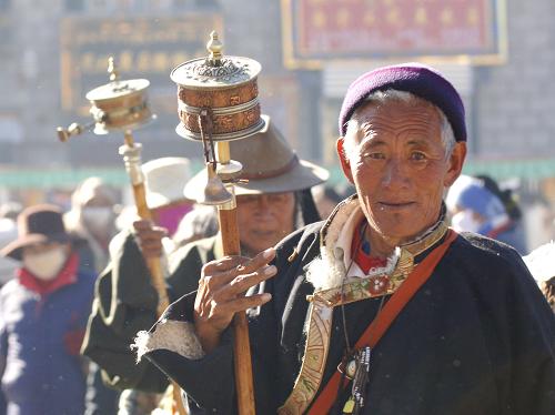 资料图片:藏族信教群众手持转经筒转八廓街(2007年11月拍摄)。新华社记者 索朗罗布 摄