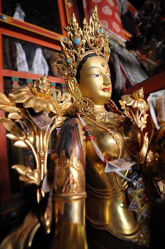 资料图片:这是萨迦寺内重要文物之一——绿度母像(2008年11月28日摄)。 国家投资8600万元的西藏萨迦寺维修工程已经完成了近80%,预计2009年将完成全部维修任务。萨迦寺始建于1073年,是藏传佛教萨迦派主寺。 新华社记者 觉果 摄