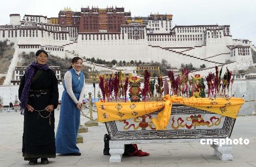 在二十三日的布达拉宫广场,不时有市民、游客在切玛前照相。据布达拉宫管理处负责人介绍,往年藏历新年期间,多以鲜花装点布达拉宫广场,今年为突出民族特色,特地在广场摆放了象征五谷丰登、来年身体康健的切玛。