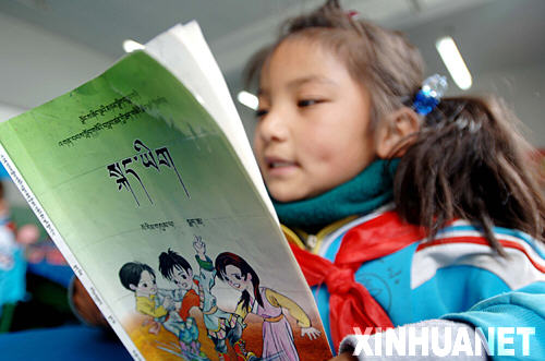 资料图片:2008年3月21日,拉萨市第一小学三年级3班学生旦珍在朗读藏语课文。西藏自治区多年来重视藏语文的教学,使每个藏族孩子从小学一年级到高中三年级都能接受藏语教育。在中小学教育期间,藏语教学在1775课时以上,全区从事藏语教学的教师超过1.55万人,藏语成为藏族孩子的必修课。新华社记者 普布扎西 摄