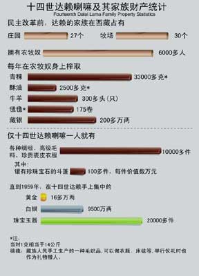 民主改革前,十四世达赖家族在西藏占有27座庄园、30个牧场,拥有农奴6000多人。每年在农奴身上榨取青稞33000多克(1克相当于14公斤)、酥油2500多克、藏银200多万两、牛羊300头、氆氇175卷。1959年,十四世达赖喇嘛本人手上有黄金16万两、白银9500万两、珠宝玉器2万多件,有各种绸缎、珍贵裘皮衣服1万多件,其中价值数万元的镶有珍珠宝石的斗篷100多件。作为旧西藏最大的农奴主十四世达赖的累累罪恶罄竹难书——