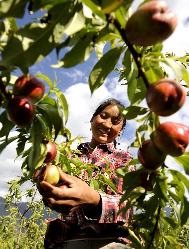 资料图片:西藏林芝地区的一名藏族姑娘在采摘水果(2008年7月9日摄)。新华社记者 普布扎西 摄