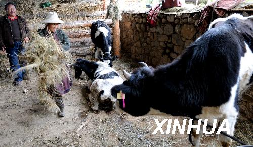 资料图片:西藏林芝地区林芝县巴果绕村农民正在给从内地引进的黑白花奶牛喂饲料(2008年10月29日摄)。新华社记者 索朗罗布 摄