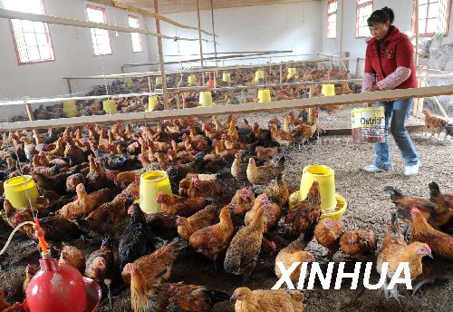 资料图片:西藏林芝地区林芝县唐堆村养鸡场的管理员周华英正在喂鸡(2008年10月28日摄)。新华社记者 索朗罗布 摄