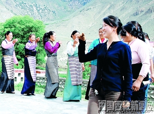 资料图片:图为朗县洞嘎镇卓村村民正在村广场上跳着欢快的锅庄。麦正伟 张明海 摄
