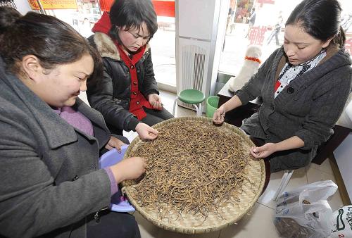 资料图片:3月14日,昌都一家商店的工作人员在筛选冬虫夏草。新华社记者普布扎西摄