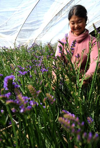 资料图片:2月8日,西藏堆龙德庆县岗德林蔬菜种植农民专业合作社藏族妇女卓嘎在查看花卉生长情况。成立于2004年底的西藏堆龙德庆县岗德林蔬菜种植农民专业合作社,除了种植蔬菜外,大力推广花卉种植,并从2008年底开始出口到尼泊尔,目前已出口牡丹、康乃馨、勿忘我等花卉15万多支。去年,参加合作社的235户农民通过种植蔬菜、花卉,平均每户获得12500元的收入。 新华社记者 索朗罗布 摄
