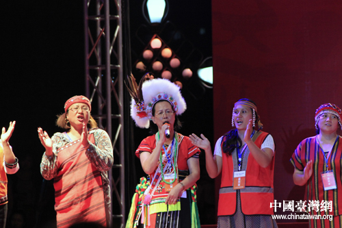 恩施市山民歌汇25日晚间上演,图为台湾少数民族代表登台表演。(中国台湾网 杨丽 摄)