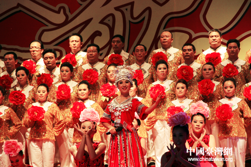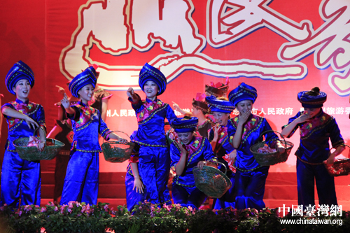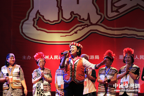 恩施市山民歌汇25日晚间上演,图为台湾少数民族代表登台表演。(中国台湾网 杨丽 摄)