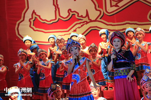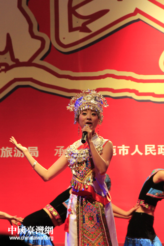 恩施市山民歌汇25日晚间上演,图为台湾少数民族代表登台表演。(中国台湾网 杨丽 摄)