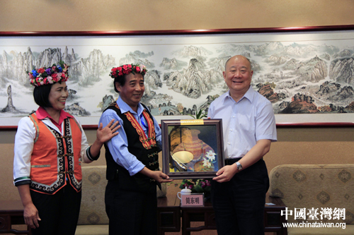 湖北省副省长田承忠25日下午在恩施会见了前来参加恩施女儿会的台湾少数民族代表一行,会见后台湾代表向田承忠赠送礼物。(中国台湾网 杨丽 摄)