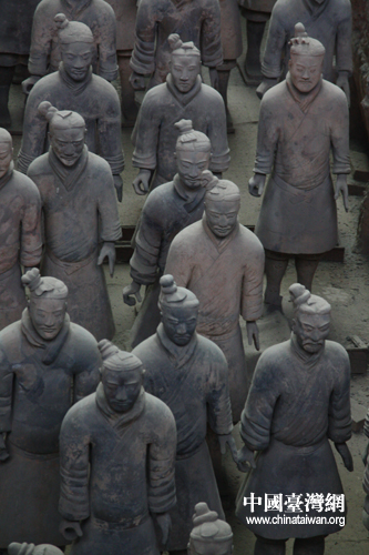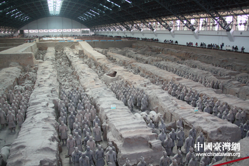 中国台湾网4月10日西安消息 参加“第五届全国网络媒体陕西行”的百余名记者来到本次活动的最后一站——秦始皇陵兵马俑博物馆,近距离的感受这号称“世界第八大奇迹”秦始皇陵和兵马俑陪葬坑。