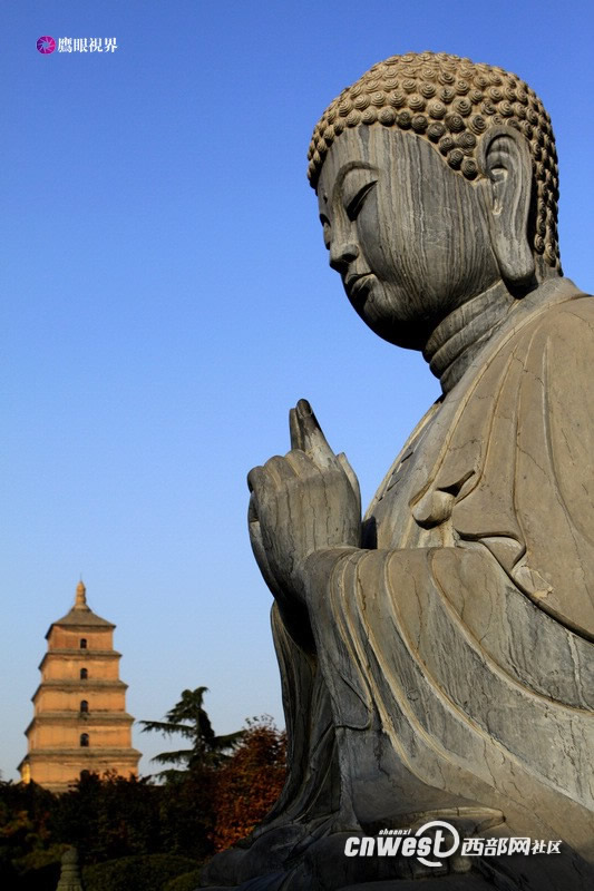 大雁塔是楼阁式砖塔,高64.517米,底层边长25米,塔身呈方形角锥体,坐落在底面积42.5×48.5米,高4.2米的方形砖台上,青砖砌成的塔身磨砖对缝,结构严整,外部由仿木结构形成开间,大小由下而上按比例递减,塔内有螺旋木梯可盘登而上。每层的四面各有一个拱券门洞,可以凭栏远眺。整个建筑气魄宏大,格调庄严古朴,造型简洁稳重,比例协调适度,是唐代建筑艺术的杰作。(网友:雄鹰在蓝天 更多图片>>)