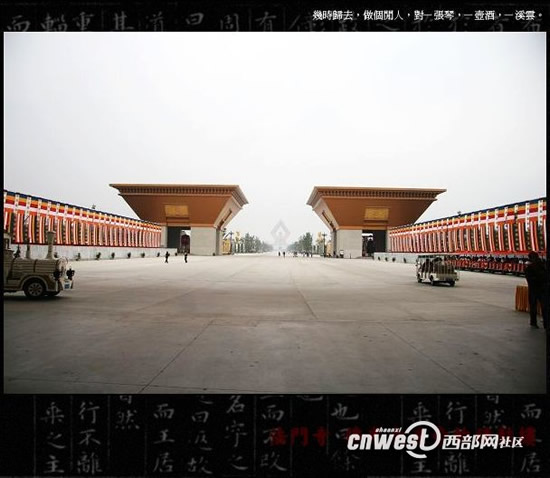 山门广场位于法门寺文化景区的入口,面积约15万平方米,建筑设计大气恢弘,山门及两侧回廊的设计方正、简洁与围合的广场一起共同体现了佛学的包容与中华传统文化“海纳百川有容乃大”的胸襟,形成一种庄严清静、慈悲祥和的氛围。穿过佛光门进入院中,净水池边14朵莲花高雅圣洁,引导人们以一颗平静之心走入佛国圣地。