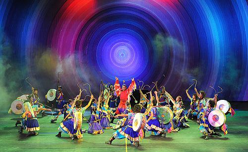 8月31日,演员在大型西藏原生态歌舞诗《幸福在路上》中表演“祈日鼓”。