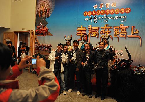 8月31日,观众在大型西藏原生态歌舞诗《幸福在路上》演出结束后与演员合影留念。新华社记者 鲁鹏 摄