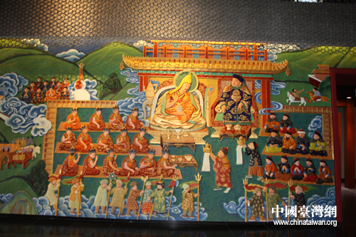 进门之后,映入眼帘的是一幅大型浮雕壁画,描述了五世达赖喇嘛赴京觐见顺治皇帝的场景。(中国台湾网 李典典摄)