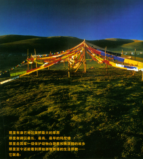 “扎溪卡”是甘孜藏族自治州石渠县的别称,在藏语里是“雅砻江边”的意思。它的地理位置在四川省西北端的川、青、藏三省区交界处,地处巴颜喀拉山南麓,距成都1070公里。境内平均海拔4000米以上,面积25000多平方公里(草地约占90%),是四川省面积最大、海拔最高的一个县,其县城海拔4200米,是名副其实的“世界高城”。那里有整个康巴藏区最大的草原,单凭这一点,就足以让人遐想联翩,心驰神往了。