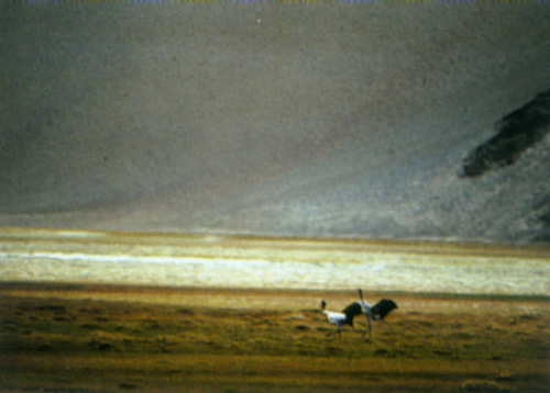 阿都措是一个美丽而幽静的高山湖泊,远远看去,湖水一半绿一半蓝,那是因为它的一边倒映着青山,而另一边倒映着蓝天,湖的四周环绕着草滩、沼泽和无数的小海子。人们都说鹤是一种非常有灵性的生物,单看它选择的这个落脚处就非同一般。据住在湖边的一户牧民讲,不知为什么今年黑颈鹤比往年走得早,只有最后飞来的一对还没有走,因为它们的孩子还小,不能长距离的飞行。牧民一家与这对黑颈鹤朝夕相伴,看着它们在此生儿育女,看着雏鹤一天天长大,俨然是两家和睦相处的好邻居。我们果然看见湖面上有两只黑颈鹤在一起游来游去,或是扇动翅膀轻盈地掠过水面,两只小鹤也跟着在水里扑腾。我们悄悄地朝它们靠近,可黑颈鹤的警惕性很高,始终与我们保持着一百米左右的“最佳”距离,我们又采取了迂回包抄的策略,想把它们赶到草滩上来。黑颈鹤似乎看破了我们的用心,并不上当,鹤妈妈机智地将儿女藏进苇草中,鹤爸爸则勇敢地在低空盘旋,不时向湖中发出声声警报。后来我们全都累得趴在地上喘粗气,再说也实在不忍心看着它们东躲西藏,便放弃了想要亲近它们的打算,别让我们的自作多情影响了它们一家子的幸福生活。