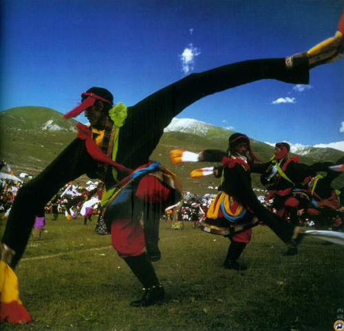 两天的车程似乎显得有些漫长,但一钻过二郎山隧道,山两边的气候就有了明显的差别,不仅空气清新凉爽,车窗外还不时有怡人的景色掠过,大渡河铁索桥、康定城跑马山、新都桥塔公寺等都是必经之地,有时间的话可以顺便一游。第二天路过的道孚、炉霍、甘孜、马尼干戈等地,村寨民居山川景物各有特色,令人目不暇接,这样的旅途当然不会让人乏味。另外还因为有了我们的藏族司机泽仁邓珠,他是一位非常热情开朗而又精力充沛的康巴汉子,这个在扎溪卡草原上长大的牛场娃,熟悉那里的山山水水,一路上他的嘴巴就没有停过,一会儿给我们讲石渠的轶闻趣事和神话传说,一会儿又和着音响里的藏歌放声歌唱,要不是在开车,说不定他还会手舞足蹈地跳上一段呢。他的快乐情绪感染了我,也情不自禁地跟着大唱起来。他还问我:“你知道我们康巴人为什么崇拜太阳和火吗?”我只知道藏传佛教中的万德吉祥标志“e”在古代就是太阳与火的象征。于是我听到了这样一个传说:相传在很远很远的年代,有一头神牦牛被冰雪禁锢在了格拉丹冬雪山上,是一群勇敢的康巴汉子爬上雪峰,从太阳引来了火种,终于使冰雪融化了,神牦牛苏醒了,一股亮晶晶的雪水从它的鼻孔中喷涌而出,从此草原上才有了涓涓溪水和清清的河流,也才有了牧歌的悠扬和草原的兴旺。难怪摄影家吕玲珑来石渠拍摄以后,就给了扎溪卡一个更响亮的名字——太阳部落。