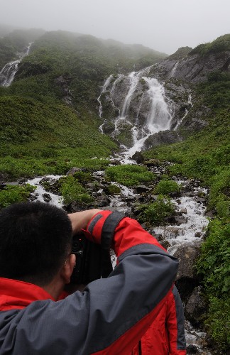 游客在墨脱县境内的瀑布前拍照(7月9日摄)。 新华社记者 格桑达瓦 摄