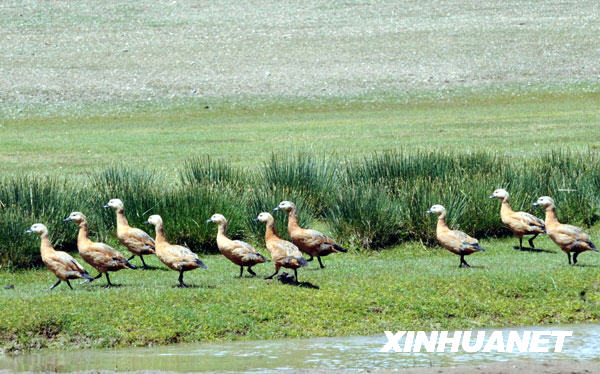 8月7日,国家二级保护动物黄鸭在藏北草原河边“漫步”。 新华社记者 唐召明 摄
