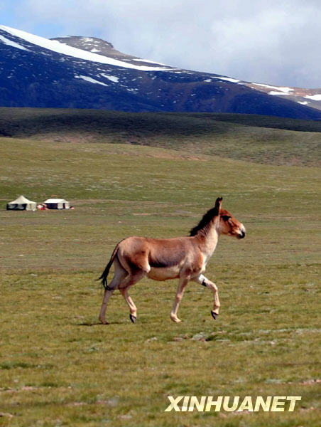 生活在羌塘自然保护区的国家一级保护动物藏野驴奔跑在草原上(7月30日摄)。 新华社记者 唐召明 摄