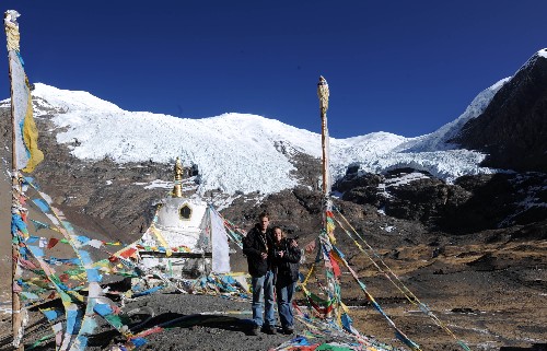 1月14日,两位外国游客在西藏卡若拉冰川前合影。 卡若拉冰川位于西藏浪卡子县和江孜县交界处,冰舌前沿海拔5560米,巨大的冰川从山顶一直延伸至路边,寒气迫人,游人触手可及。 新华社记者 金良快 摄