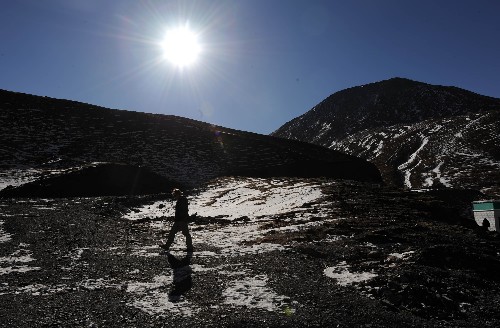 1月14日,一位外国游客在西藏卡若拉冰川前行走。 新华社记者 金良快 摄