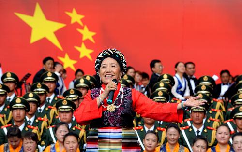 西藏自治区领导张庆黎、列确、郝鹏、吴英杰、崔玉英、金书波、尹德明、公保扎西等和拉萨各族各界群众聚集一堂,共同高唱爱国歌曲,在优美、豪迈的旋律中展示西藏各族干部群众的爱国热情,以及建设社会主义新西藏的坚定信念,共同祝福伟大祖国繁荣昌盛。