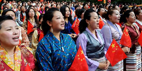 9月2日,教育界代表演唱爱国歌曲。当日,拉萨举行西藏自治区“迎国庆·歌唱祖国——爱国歌曲大家唱”大型演唱会,1500多名各族各界代表用歌声喜迎新中国60岁华诞。 新华社记者 格桑达瓦 摄