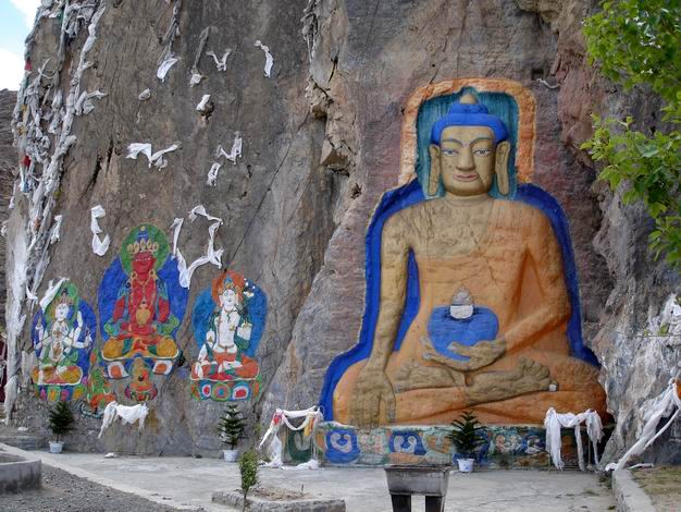 聂塘大佛是西藏最大的一尊摩崖造像。位于拉萨市西南40公里的聂塘山北麓,面向拉萨市,东临拉萨河,拉泽公路鱼贯而过。造像为释迦牟尼佛在菩提树下降魔成道的坐像,通高9.83米,宽7.9米,坐高1.3米,手长1.4米,脚长1.9米,系高浮雕,其造像洗练,比例适度,气势雄浑,伟岸绝伦,被誉为西藏石刻之最。此大佛是后弘期早期作品。