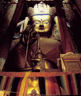 佛像全身共用紫铜皮二十三万余斤,黄金八千多两,眉间白毫用的大金钢钻石三十个,大珍珠三百余颗及各种珊瑚、琥珀、松耳石等一千四百多。由一百一十名工匠,花了二年多的时间才将佛像建成,成为世界上最大的镀金铜佛。佛教认为,五亿七千年之后强巴佛将接替释迦牟尼而成为佛教至尊,故称之为未来佛。