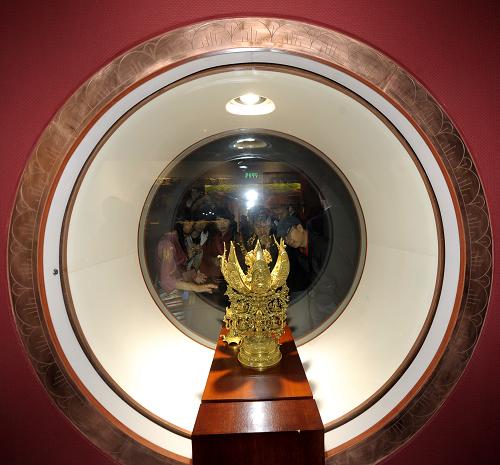 8月11日,游客在布达拉宫珍宝馆参观,图中文物即为“八瓣莲花喜金刚坛城像”。 新华社记者 普布扎西 摄