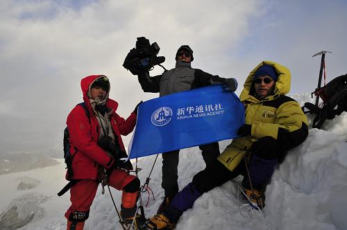资料图片:5月3日,参加采访西藏第九届春季登山大会的新华社西藏分社三名记者与山友一同登顶。当日,经过6个小时艰难跋涉,18名参加西藏第九届春季登山大会的山友成功登顶海拔6206米的启孜峰。登山教练 林生 摄