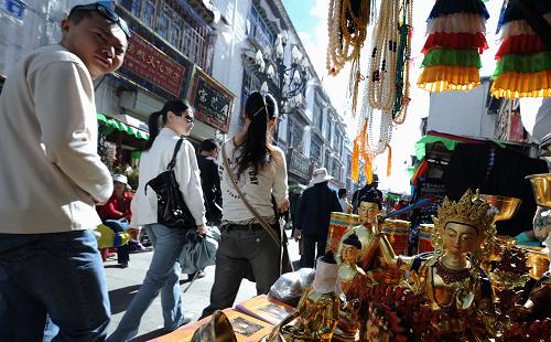 资料图片:几名游客从拉萨八廓街上的商铺旁经过(6月9日摄)。新华社记者格桑达瓦摄