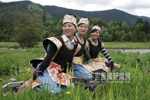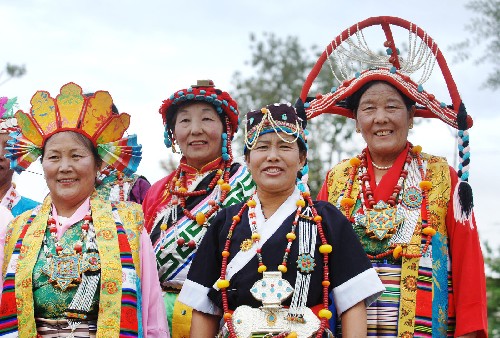 资料图片:2008年8月26日,西藏日喀则地区群艺馆的藏族老阿妈在展示后藏妇女服饰。新华社记者 索朗罗布 摄