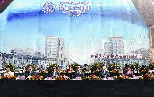 2009年4月25日上午,西藏最大的房地产项目——海亮世纪新城,开工仪式在拉萨柳梧新区举行。张庆黎、公保扎西、孟德利出席开工仪式并为工程奠基。(图片来源:《西藏日报》旦增 摄)