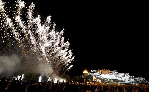 资料图片:8月20日,2009中国拉萨雪顿节开幕,当晚布达拉宫广场上举行音乐焰火晚会。新华社记者 普布扎西 摄