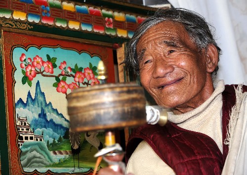 资料图片:88岁的阿旺老人在拉萨市福利院安度晚年(1月14日摄)。50年前,阿旺是藏北草原上的农奴。新华社记者 觉果 摄