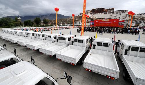 6月29日,为西藏行政村配备的农用运输车停放在布达拉宫广场。当日,党中央、国务院为“西藏百万农奴解放纪念日”向西藏农牧民群众赠送物资仪式在拉萨举行。党中央、国务院在西藏庆祝“西藏百万农奴解放纪念日”之际,下拨5.3亿多元专项经费,专门用于为西藏行政村配备农用运输车,实施西藏无电地区应急照明工程,给有电地区群众配备广播电视接收器,给“三老”人员发放慰问金和颁发纪念证书,对生活困难群众发放补贴经费。新华社记者觉果摄