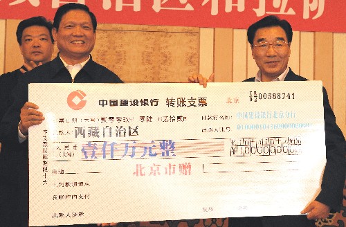 资料图片:6月26日,中共中央政治局委员、北京市委书记刘淇(前左)与西藏自治区党委书记张庆黎交接北京市赠给西藏自治区的1000万元支票。新华社记者 格桑达瓦 摄