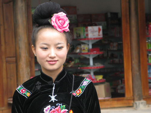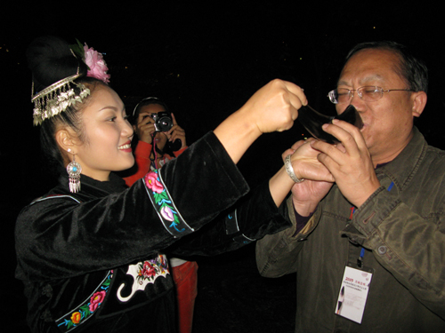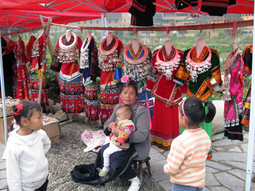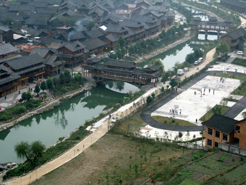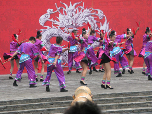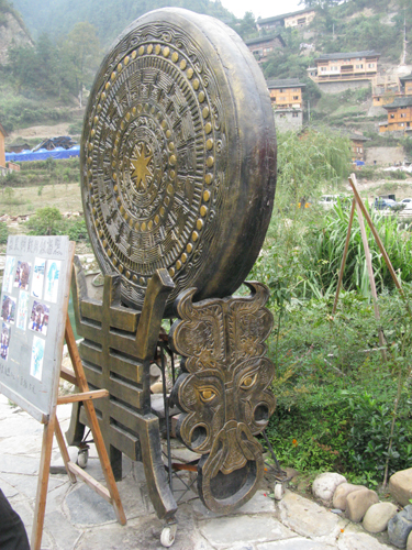 据当地苗人介绍,苗族的祖先是蚩尤,因为与屡败炎、黄二帝,迫使黄帝联合炎帝在涿鹿大战蚩尤,蚩尤战败身亡,部分苗人与炎黄部落联盟融合,部分苗人自上古时代从黄河流域一路南迁,直到19世纪才在湘、黔、滇一带定居下来。从历史渊源看,苗文化和汉文化同为中华文明的主流文化,共同的龙图腾表现的是苗、汉两个民族之间说不清道不明的血缘关系,在西江苗寨广场舞台中央硕大的龙纹图案向世人表明,苗族文化是极为正统的中华文明的又一瑰宝。