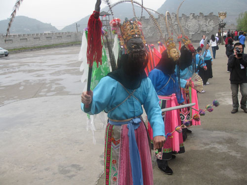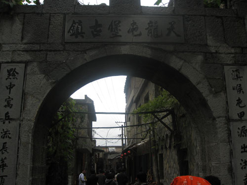 “贵州三屯”中的海龙屯堡、玛瑙山屯堡有军事要塞的显著特点,而天龙屯堡则体现平战结合的特殊构架,或者近似今天的“新疆生产建设 兵团”。到达安顺云峰屯堡的民俗博物馆后,我们一眼看到一些打扮奇异的女子——宽衣大袖,衣长及膝,领口、袖口、前襟边缘皆镶有流苏花纹 ,腰间还系有织锦丝带,她们就是“屯堡人”。相传,明朝开国皇帝朱元璋为统治南方,从中原、湖广和两江地区把一些工匠、平民和犯官等强行迁至今贵州安顺一带居住,随着历史的 变迁,繁衍出一种“屯堡文化”——屯堡人将明朝时期的语言、服饰、民居建筑及娱乐方式等文化习俗一直沿袭至今,成为明朝历史的活化石 。屯堡女子的服饰非常有讲究。未婚女子,当地人称作“小娘娘”,她们的装束通常梳长独辫,衣服颜色比较鲜艳;已婚女子,被称作是“ 大娘娘”,头发挽成圆网罩于脑后,媳妇戴白头巾,婆婆戴黑头巾。额前的头发被她们称为“苦发”,在结婚前一晚,母亲会将新娘把前额的 “苦发”一根根地拔掉,盼望女儿今后过上好日子。走进云峰屯堡最具代表性的村寨之一本寨,一座座有着600年历史的石头民居依然保存完好,整个村寨就是一座石头城堡,石头的瓦盖、石 头的房、石头的街道、石头的墙……在石墙的包裹下,是浓浓的江淮余韵。由于屯堡人多数都是从江淮一带迁徙而来的书香门第,因此他们的 房屋既有江南四合院的特点、又有华东四合院的布局,在房屋布局的细节之处,我们能够强烈感受到浓浓的汉文化的魅力,如在大门门雕上一 般都会雕刻精美的图案,“龙凤呈祥”表明大富大贵、在院内天井的对角一边是鲤鱼的地漏,一边是龙门的地漏,则有希望孩子“鲤鱼跃龙门 ”的含义等。地戏是当地颇有特色的代表性文化之一,记者们一行在安顺云峰屯堡、天龙屯堡都看到了类似的表演。在天龙屯,记者饶有兴致地观看了 一场名为《陆文龙双枪战武将》的地戏,演员们额上戴着简练夸张的木雕面具,身着长衫,背插小旗,腰系战裙,手持木制短刀长枪,形神兼备,独具魅力,引来观众们的阵阵叫好声。在云峰屯堡、天龙屯堡采访时,我们看到,六百多年后的今天,当你来到这里时,发现这些明屯军的后裔至今仍固执地保持着明朝时故乡江南的生活习惯:依旧乡音不改,身穿大明朝的长衣大袖,仍旧跳着明朝的军傩(地戏),甚至连饭菜口味都与贵州当地其他地方大异……因为大山的阻隔,历史似乎将这些屯堡遗忘了,却也给我们保留了一个回到六百年前历史的好去处。